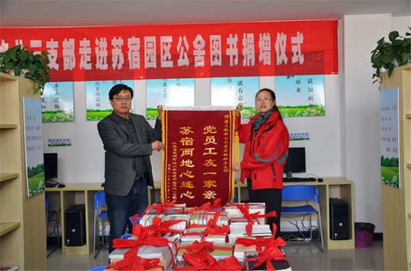 活動(dòng)現(xiàn)場(chǎng),陳彤彤代表蘇大教服集團(tuán)黨委物業(yè)三支部捐贈(zèng)了《紅樓夢(mèng)》、《中國(guó)文學(xué)》、《管理學(xué)》等書(shū)籍20余種310冊(cè)和羽毛球拍、乒乓球拍等文體用品;張?bào)K代表建發(fā)公司向蘇大教服集團(tuán)黨委物業(yè)三支部贈(zèng)送了題為“黨員工友一家親,蘇宿兩地心連心”的錦旗,以示感謝。