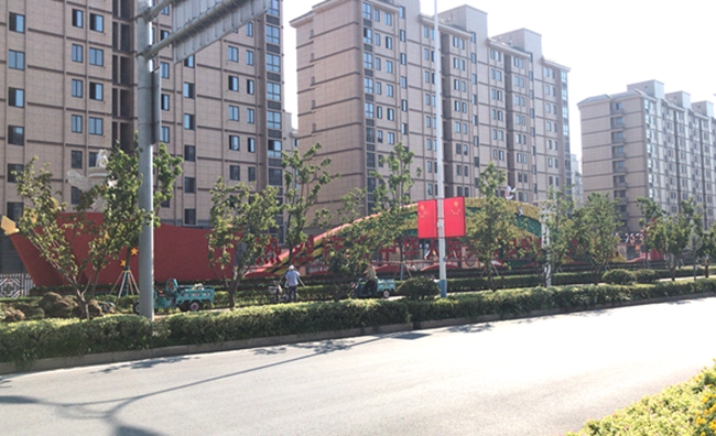 近期,走在道路上,園區(qū)居民會(huì)發(fā)現(xiàn)青海湖西路東入口南側(cè)設(shè)置一座建國(guó)70周年景觀雕塑,同時(shí)道路兩側(cè)路燈桿件懸掛國(guó)旗、中國(guó)結(jié)和70周年標(biāo)識(shí)的中國(guó)結(jié)等各式各樣的節(jié)日氛圍。