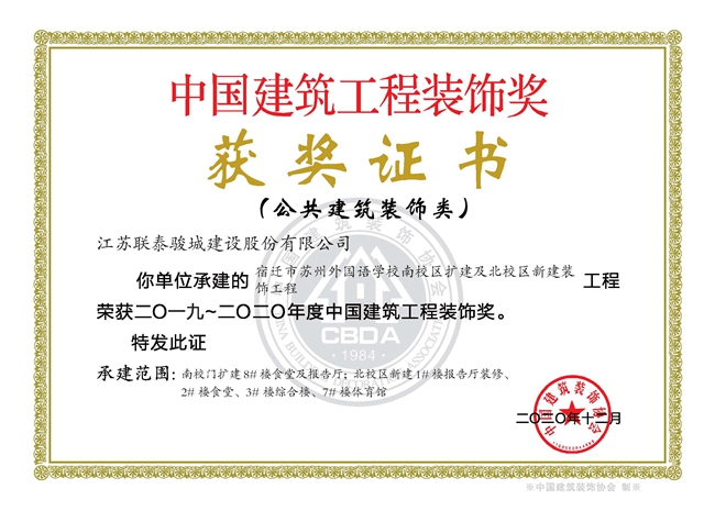 近期,傳來(lái)喜訊,由開發(fā)公司代建的宿遷市蘇州外國(guó)語(yǔ)學(xué)校南校區(qū)擴(kuò)建及北校區(qū)新建裝飾工程獲得中國(guó)建筑裝飾行業(yè)最高獎(jiǎng)項(xiàng)“中國(guó)建筑工程裝飾獎(jiǎng)”。