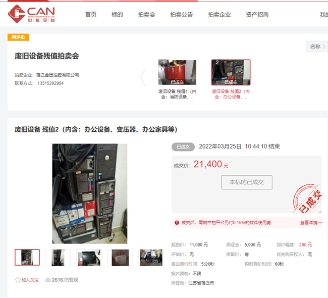 3月25日上午10時30分,開發(fā)公司一批廢舊辦公設(shè)備、辦公家具、變壓器等物資在中拍平臺公開拍賣,7家競買人,經(jīng)過14分10秒緊張激烈競價(jià),最終以21400元成交。