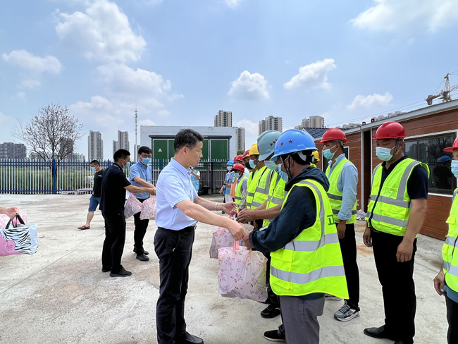 為切實(shí)維護(hù)高溫期間建筑工人身體健康,保障建筑工人在生產(chǎn)過程中的安全與健康,切實(shí)做好安全文明施工,確保工程項(xiàng)目順利推進(jìn)。7月1日上午,總經(jīng)理劉建華帶隊(duì)慰問建設(shè)工程施工現(xiàn)場(chǎng)工人,給他們送去毛巾、香皂、洗發(fā)水等防暑降溫用品,感謝他們對(duì)園區(qū)工程建設(shè)作出的貢獻(xiàn)。
