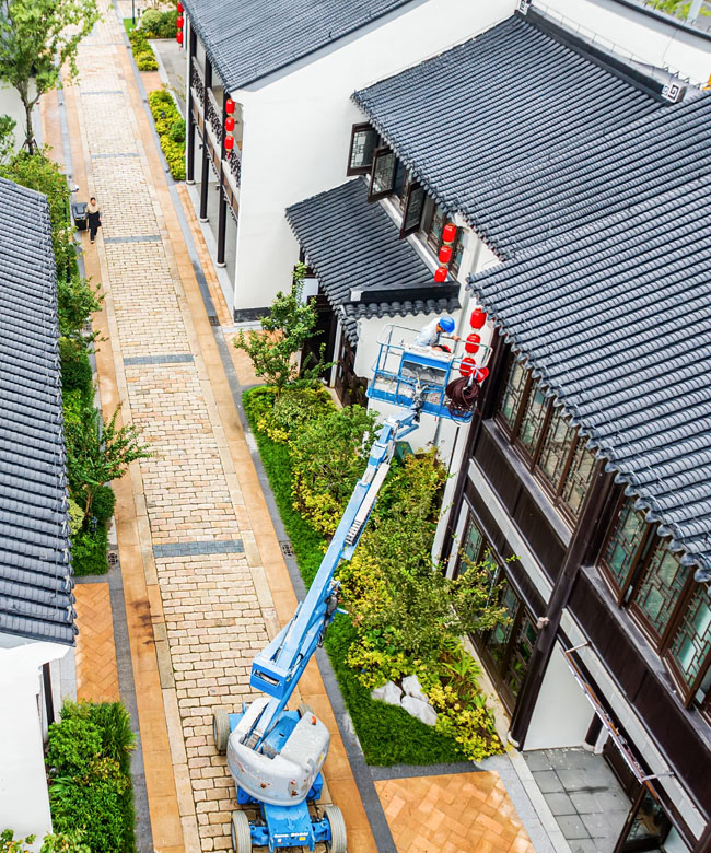 2023年9月25日,蘇宿工業(yè)園區(qū)蘇州街,工人們正在掛燈籠,喜迎中秋、國(guó)慶雙節(jié)到來(lái)。大紅燈籠與白墻青瓦綠樹相映成趣,成為一道靚麗的風(fēng)景線,營(yíng)造了歡樂、喜慶、祥和的節(jié)日氛圍。