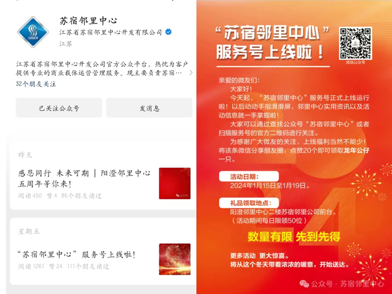 “蘇宿鄰里中心”服務(wù)號,是蘇宿鄰里公司官方賬號,旨在構(gòu)建社群關(guān)系、活動宣傳、商鋪招租及有關(guān)政策等方面提供最新資訊,讓載體變得有溫度起來。