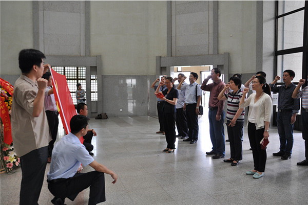 在周恩來紀念館總理雕像前,駱敏、周原敬獻了花籃,園區(qū)各局辦、開發(fā)公司黨員負責同志面對鮮紅的黨旗,莊嚴地舉起右拳齊聲宣誓,重溫了入黨誓詞。