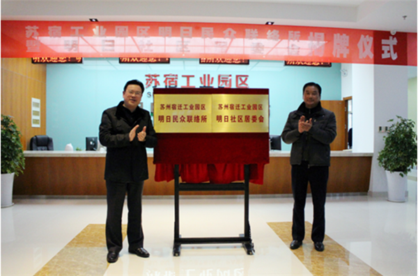 1月6日,宿遷市副市長(zhǎng),蘇宿園區(qū)黨工委書記、管委會(huì)主任方文浜與居民代表侍軍共同為明日民眾聯(lián)絡(luò)所和明日社區(qū)居委會(huì)揭牌,園區(qū)第二個(gè)民眾聯(lián)絡(luò)所正式建成投用,第一個(gè)社區(qū)居委會(huì)正式成立。