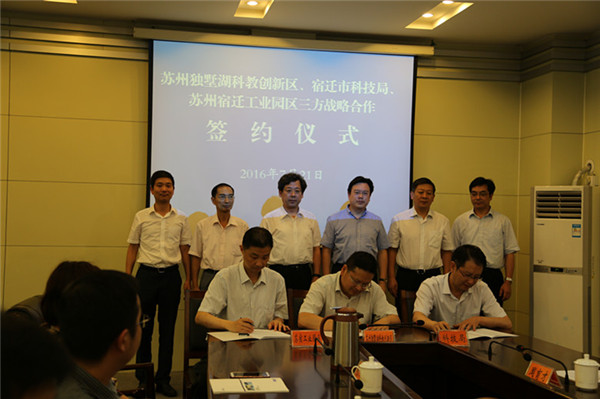 7月21日下午,蘇州獨墅湖科教創(chuàng)新區(qū)管委會、宿遷市科學(xué)技術(shù)局、蘇州宿遷工業(yè)園區(qū)管委會三方戰(zhàn)略合作協(xié)議簽約儀式在宿遷舉行。根據(jù)協(xié)議,三方將在科技資源轉(zhuǎn)移、科技平臺建設(shè)以及科技環(huán)境優(yōu)化等方面推進合作。這是蘇宿兩地合作內(nèi)涵逐步深化、合作領(lǐng)域不斷拓寬、合作水平全面提升的重要體現(xiàn),更是深入貫徹落實省委、省政府部署的重要舉措。市委副書記、市長王天琦,副市長、蘇宿工業(yè)園區(qū)黨工委書記、管委會主任方文浜,市政府秘書長章其波見證簽約。